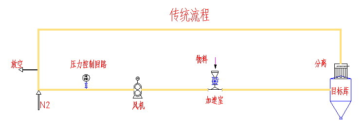 傳統的氮氣閉環(huán)輸送系統,氮氣的消耗量非常大。主要是由于管路、設備的泄露,導致輸送間隙管內多余的氮氣被排出,還有因目的地料倉內部的物料填充而導致氮氣被排出。高額的氮氣在輸送環(huán)節(jié)中不斷流失,直接影響到生產成本。