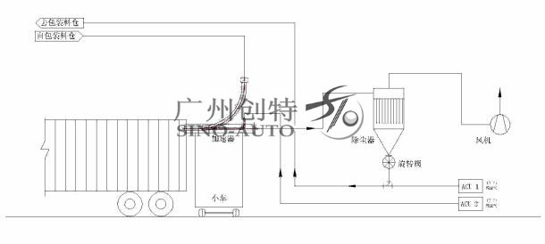 通過風(fēng)機(jī)吹送,把物料送入集裝箱內(nèi),充填能力大于5噸/小時。